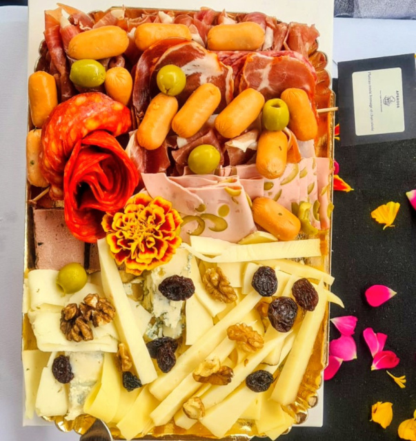 Un plateau généreux composé d’une sélection de charcuteries et de fromages, accompagné de garnitures et de touches gourmandes pour un moment convivial à partager.