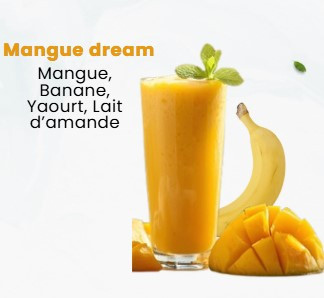 Un smoothie onctueux composé de mangue, banane, yaourt et lait d’amande.